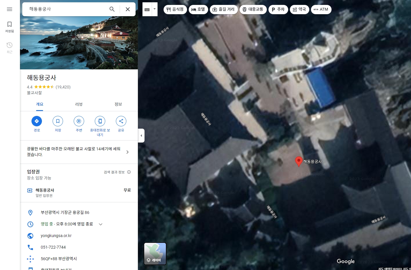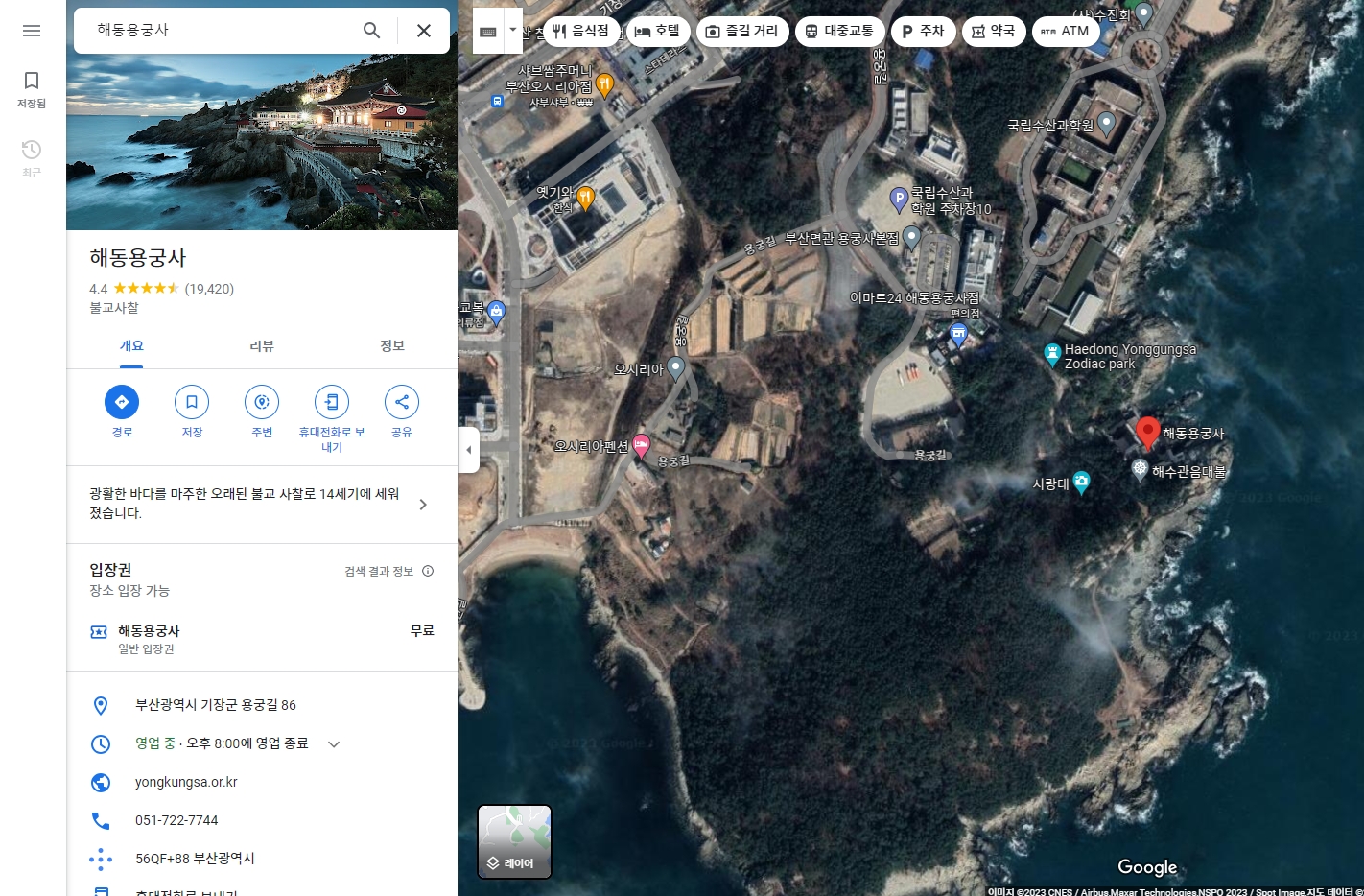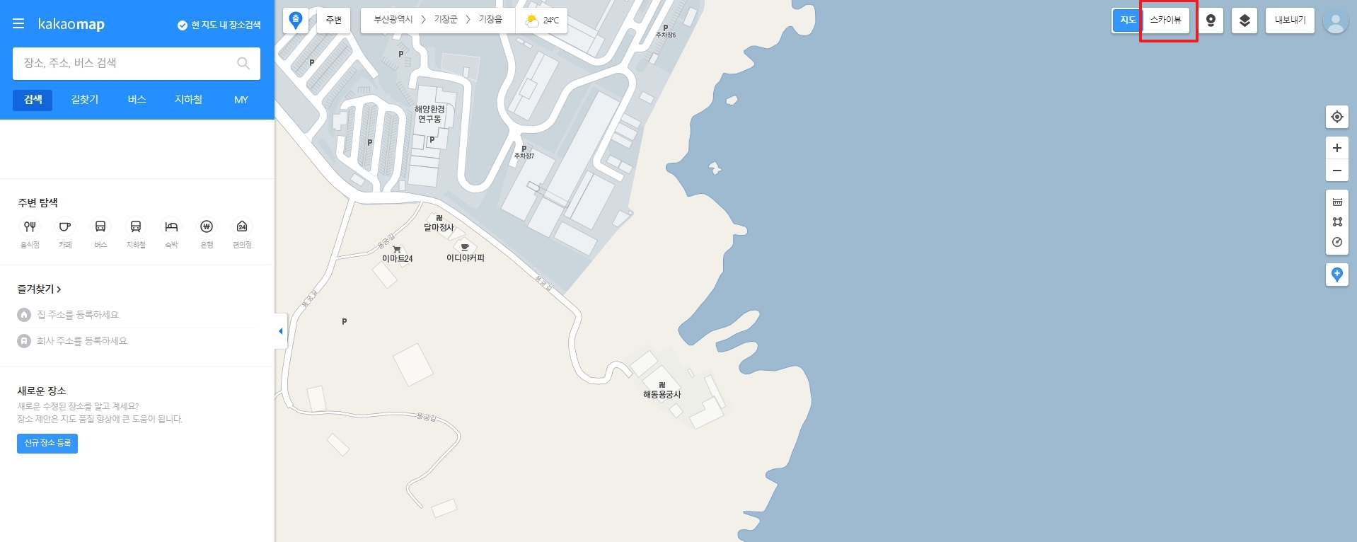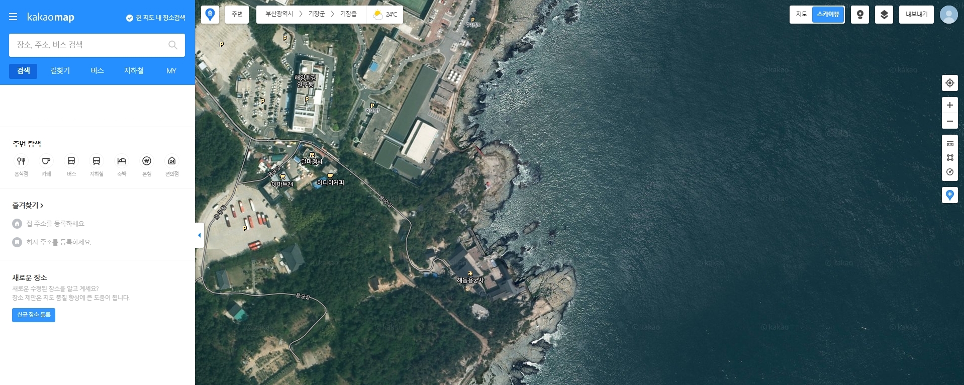 6. 찾고 싶은 장소를 입력해서 이동합니다. 이번에도 아까 봤던 해동 용궁사를 검색해볼게요. 구글 지도는 검색 속도가 빠르고 자동완성 기능도 잘 되어 있어서 금방 원하는 위치를 찾을 수 있어요.