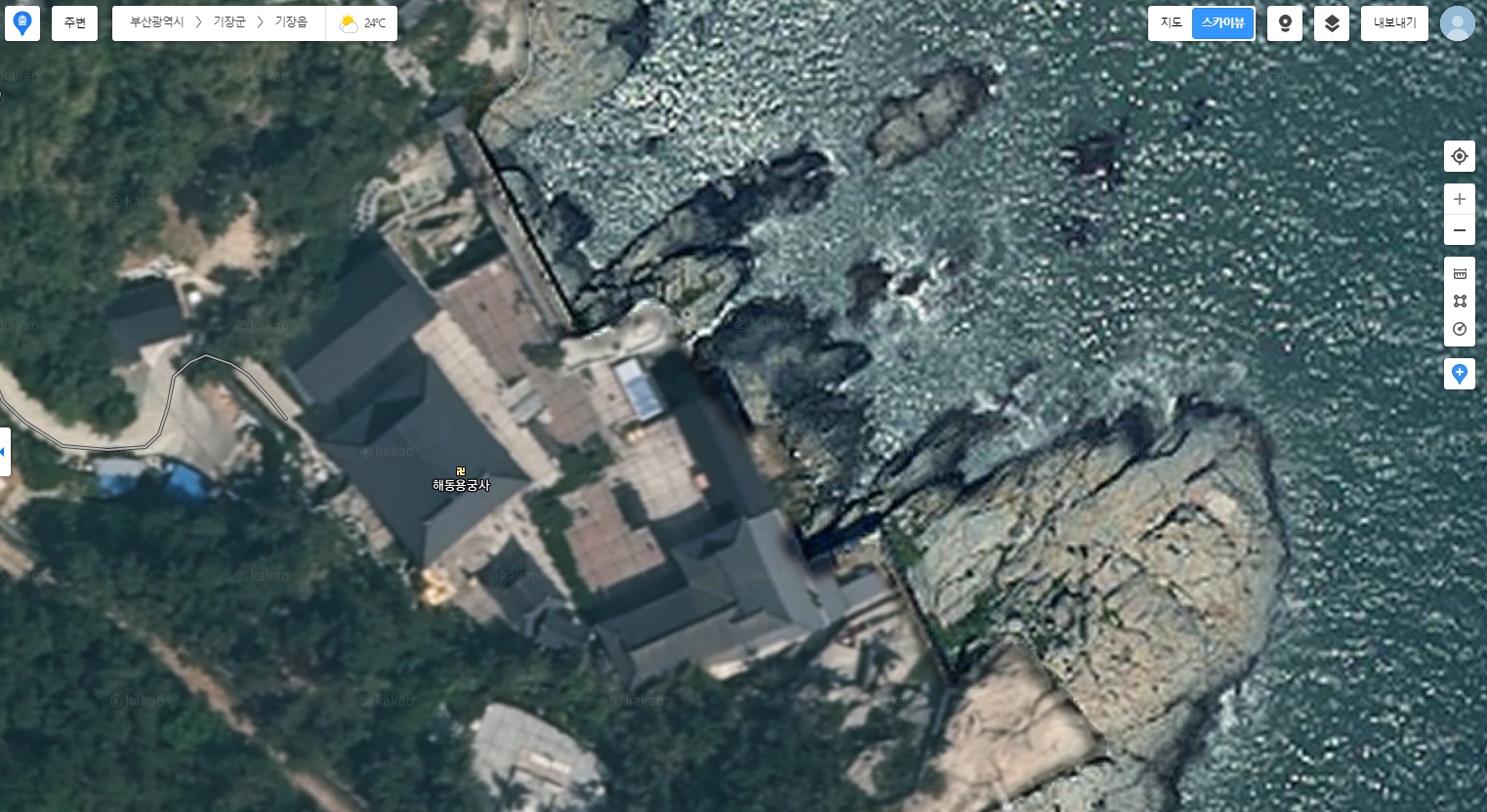 4. 스카이뷰 상태에서 지도를 최대한 확대해 보세요. 생각보다 디테일이 살아있어서, 길찾기뿐만 아니라 여행지 탐색할 때도 정말 좋아요. 여기 보이는 곳은 부산의 해동 용궁사인데요, 저도 예전에 여행 계획 짤 때 이렇게 미리 확인했었어요!