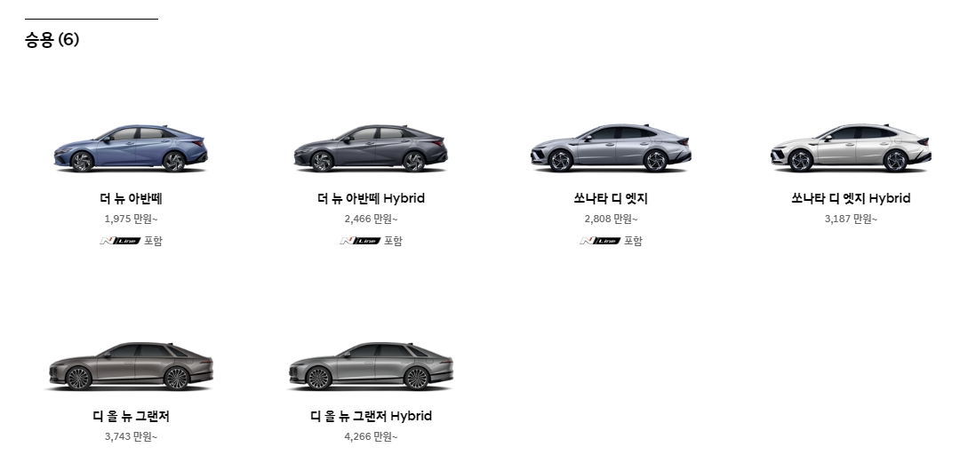 5. 승용차 항목에서는 아반떼, 쏘나타, 그랜저 같은 인기 모델들이 줄줄이 나옵니다. 특히 하이브리드 버전은 연비가 워낙 좋아서 장거리 주행이 많은 분들께는 정말 현실적인 선택이 될 거예요.