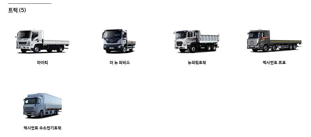 9. 트럭 섹션에서는 마이티, 파비스, 파워트럭, 엑시언트 시리즈 같은 중대형 트럭들이 있어요. 물류 운송이나 건설 현장용 차량을 찾으시는 분들께 믿고 맡길 수 있는 라인업입니다.