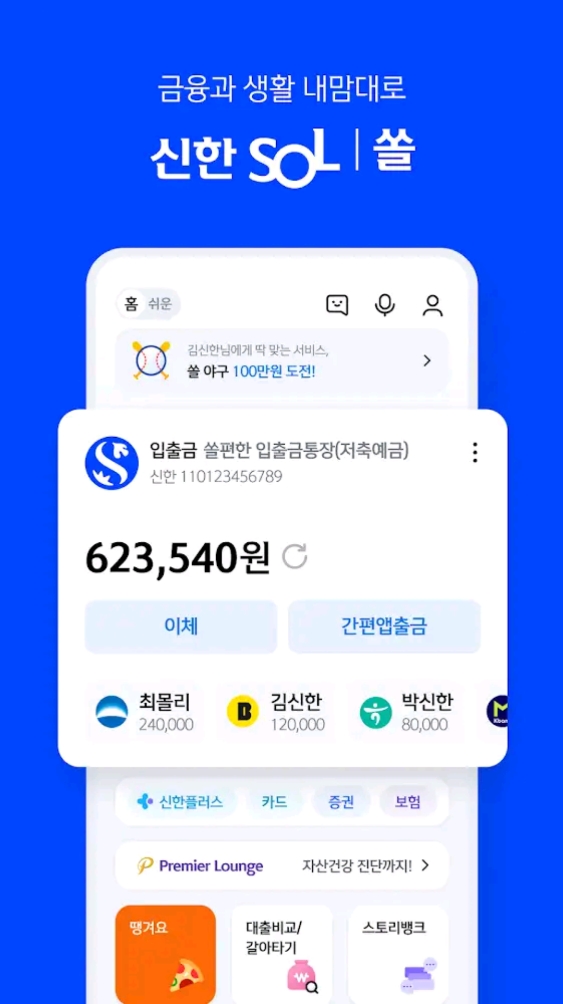 쏠 앱에서는 잔액 조회부터 이체, 카드 승인 내역 확인, 지출 관리 알림까지 다양한 서비스를 제공합니다. 특히 이체할 때 간편 모드를 이용하면 목적에 맞는 이체 방법을 순서대로 안내해 주기 때문에 복잡한 메뉴를 넘길 필요가 없어요.