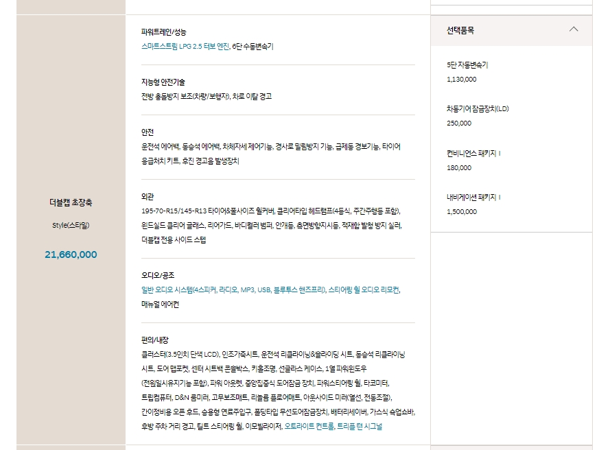 일반캡 장축 모델은 기본 스타일이 이천이백만 원 중반대에 자리 잡고 있으며, 스마트·모던·프리미엄 순으로 사양이 높아질수록 이천사백만 원 초중반까지 올라갑니다. 트럭 본연의 경제성을 유지하면서도 필수 편의 사양을 두루 갖췄습니다.