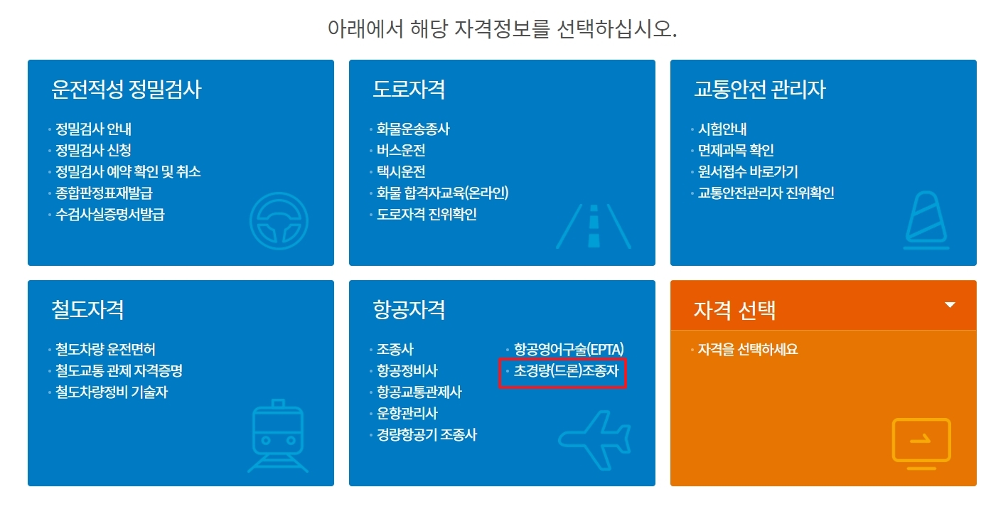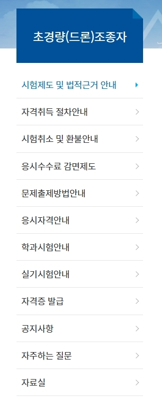 2. 메인 화면에서 상단 메뉴 중 항공자격을 선택하고, 그 아래 항목 중 초경량(드론)조종자를 클릭하세요. 이 항목은 드론 조종 면허와 관련된 모든 정보를 확인할 수 있는 곳입니다. 특히 자격증 종류, 준비 과정, 응시 조건 등이 잘 정리되어 있습니다.