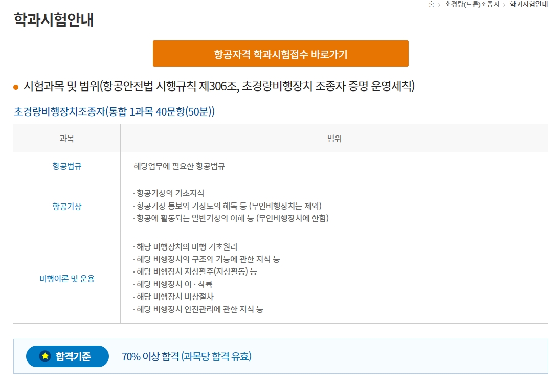 4. 필기시험은 항공안전법 시행규칙 제306조와 관련 운영세칙에 따라 진행되며, 전체 과목 중에서 평균 70점 이상을 받아야 합격입니다. 과목별 합격 처리가 되기 때문에 한 과목만 떨어져도 그 과목만 재응시하면 됩니다.