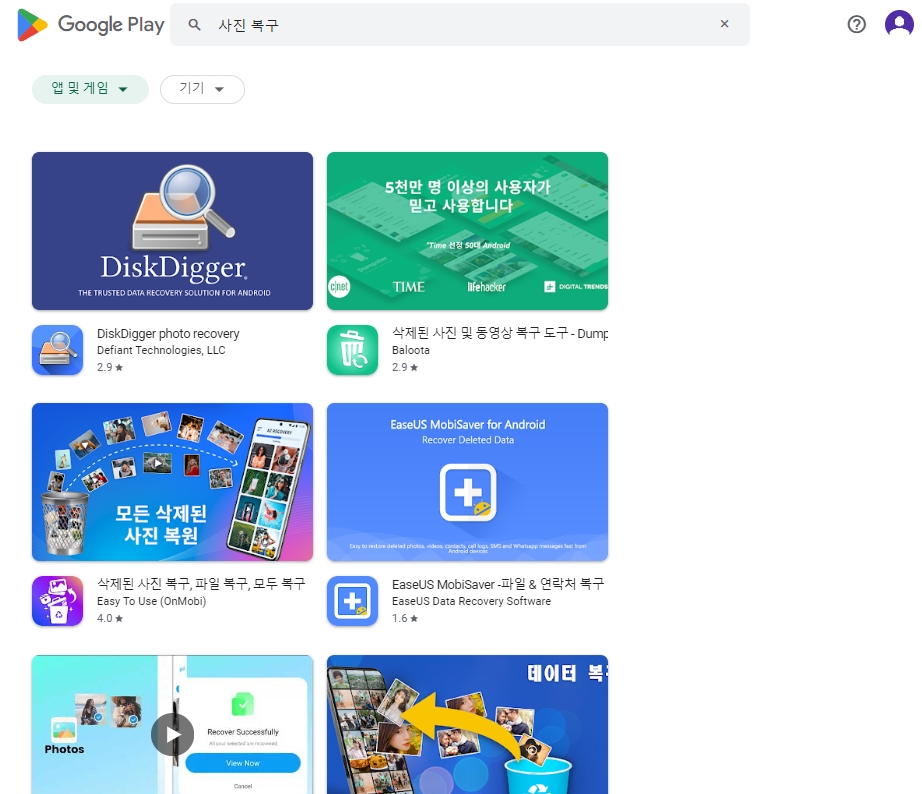 추가로, 플레이스토어로 들어가서 사진 복구 어플을 다운로드 받을 수 있습니다. 다양한 복구 어플이 있으며, 사용자 리뷰를 참고하여 신뢰할 수 있는 앱을 선택합니다. 또 다른 방법은 컴퓨터에서 복구 프로그램을 다운 받아 USB를 통해 휴대폰에 연결하여 사용하는 것입니다. 어떤 프로그램이든 사용자들이 많이 사용하는 것을 선택하는 것이 안전합니다.