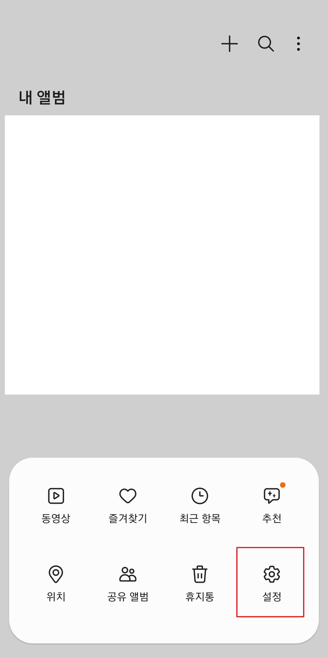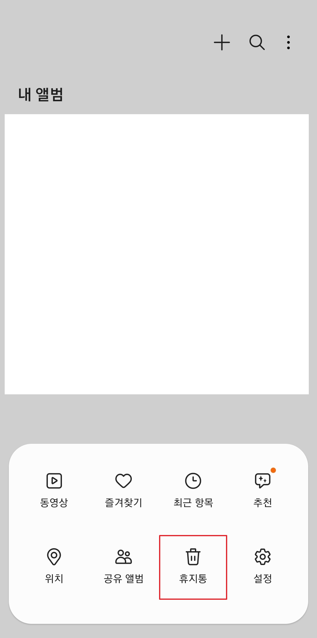 갤러리로 들어가서 우측 하단의 가로 3줄 버튼을 클릭합니다. 메뉴창이 열리는데 여기서 휴지통을 클릭합니다.