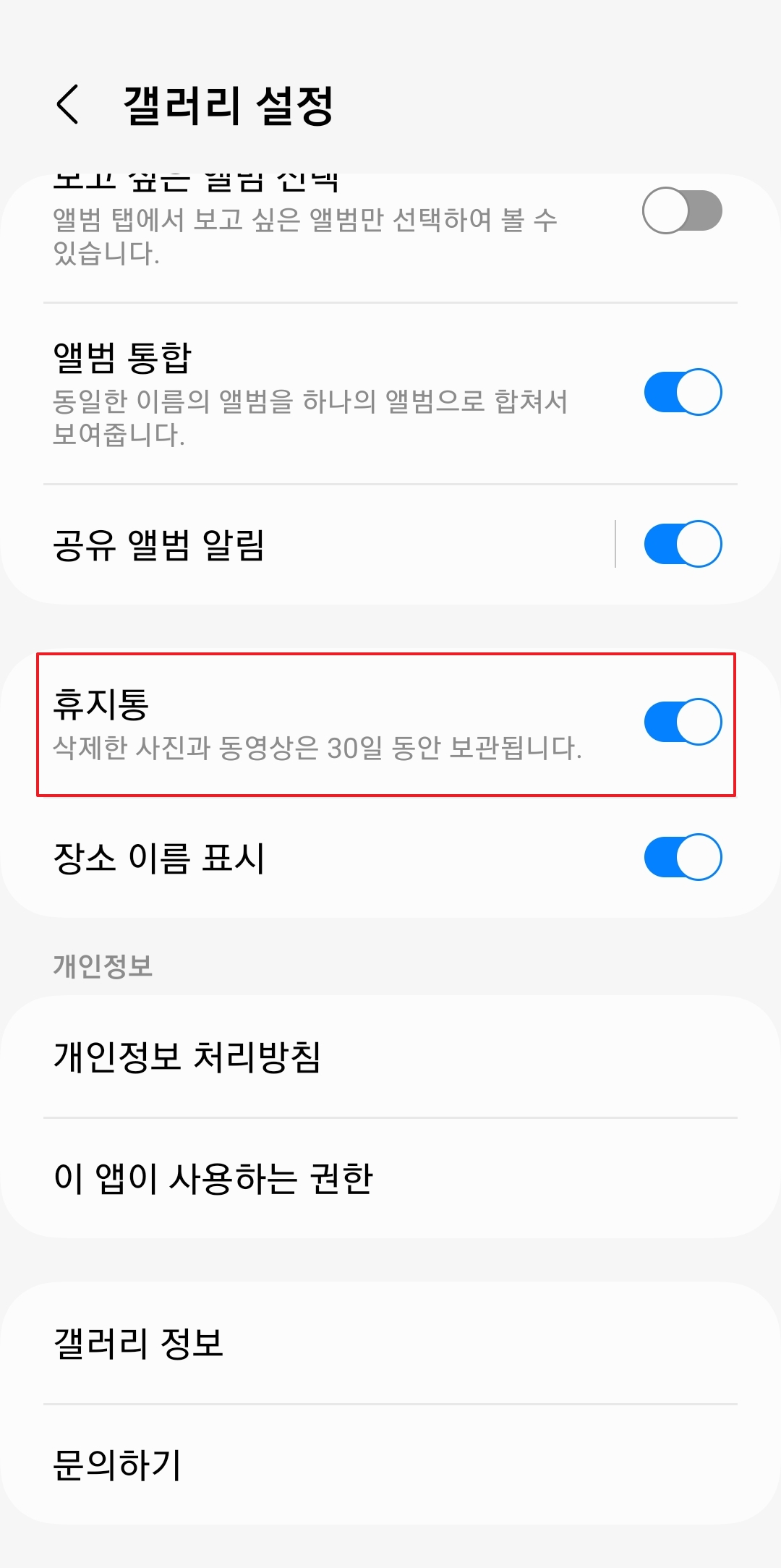 만약 휴지통 기능을 사용하고 있지 않았다면 설정으로 들어가서 화면을 아래로 내려서 휴지통 기능을 켭니다. 지금이라도 켜두고 나중을 대비하는 것이 좋습니다.