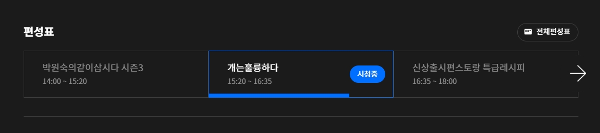 6. 영상 아래에는 지금 방송 중인 프로그램 정보와 이어서 나올 프로그램들이 시간 순으로 간단하게 나옵니다. 또, 전체 편성표 버튼을 누르면 라디오 포함한 모든 채널의 일정도 한눈에 볼 수 있습니다.