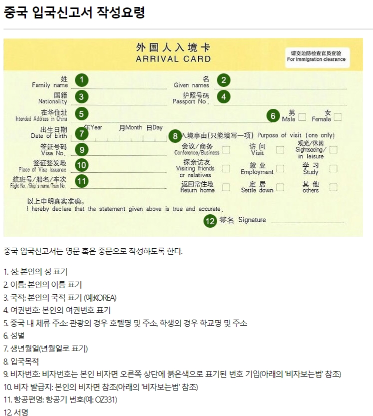 2. 사이트에 들어가면 중국 입국신고서 작성법이 정리되어 있어요. 주요 항목은 여권과 일치해야 하고, 성명, 국적, 여권번호는 물론이고, 중국에 머무를 숙소 주소도 적어야 합니다. 그 외에도 성별, 생년월일, 입국 목적, 비자번호, 항공편명, 서명까지 꼼꼼히 채워야 하니 미리 준비하는 게 좋아요.