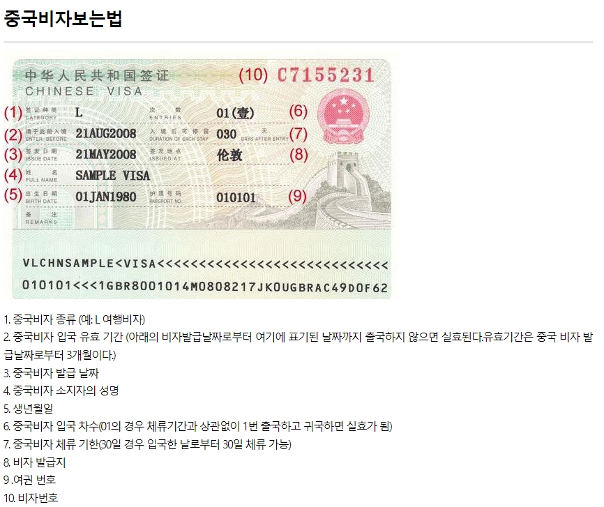 4. 마지막으로, 중국비자 보는 방법도 같이 나와 있어요. 비자에 적힌 번호나 발급지 같은 정보는 입국신고서 작성할 때 꼭 필요하니까, 헷갈리지 않도록 잘 체크해두셔야 해요.