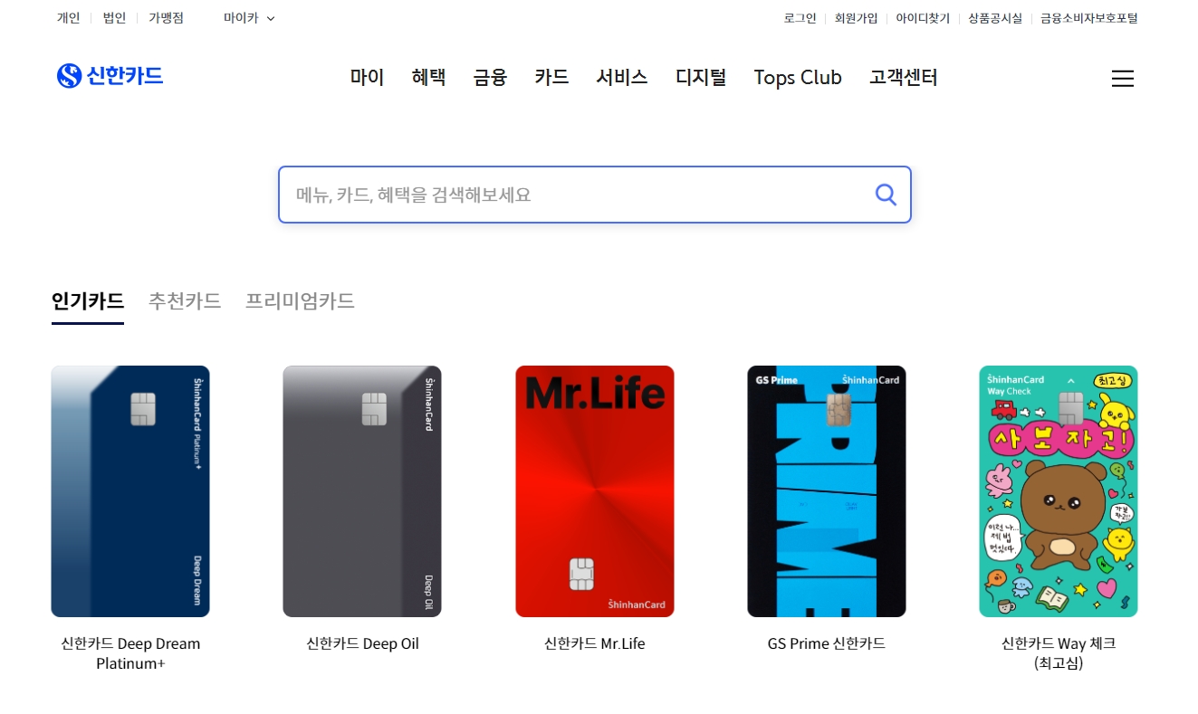 1. 신한카드 공식 홈페이지에 들어가면 다양한 카드 상품과 서비스에 대한 정보가 한눈에 정리되어 있습니다. 카드 종류, 혜택, 이벤트 소식까지 보기 쉽게 구성되어 있어서 필요한 정보를 직접 찾아보기 좋습니다.