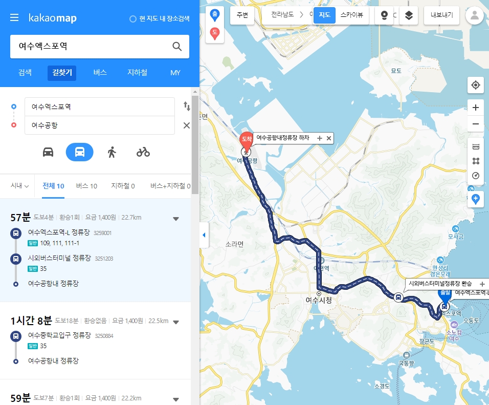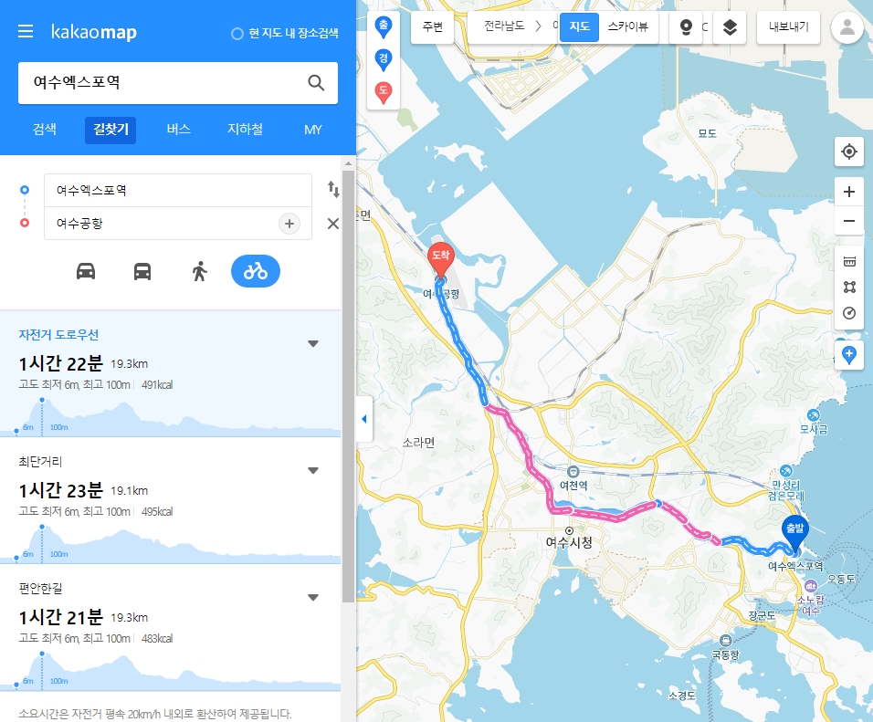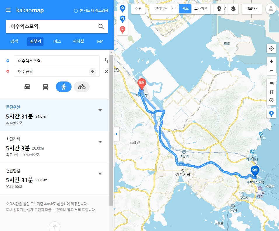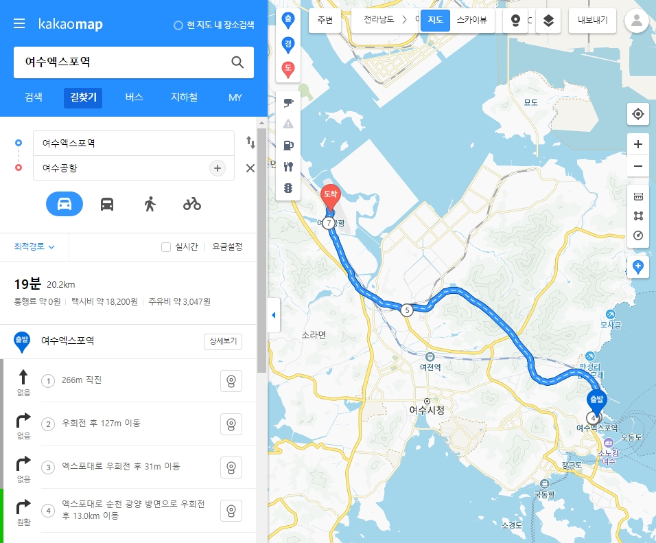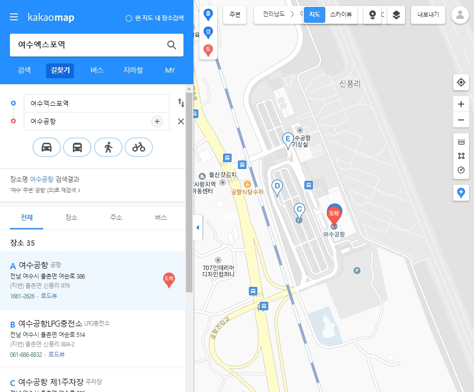 4. 도착지도 위와 같은 방식으로 검색해서 선택하시면 됩니다. 저는 ‘여수공항’을 도착지로 지정했습니다. 도착지를 설정하면 자동차, 대중교통, 도보, 자전거 이렇게 네 가지 아이콘이 활성화돼요. 이 중에서 원하는 이동 수단을 골라서 누르시면 됩니다.