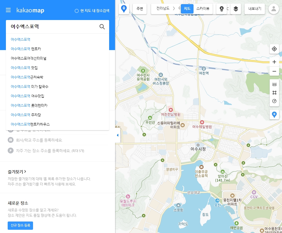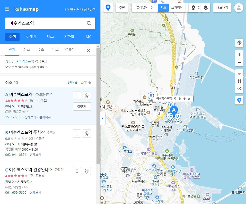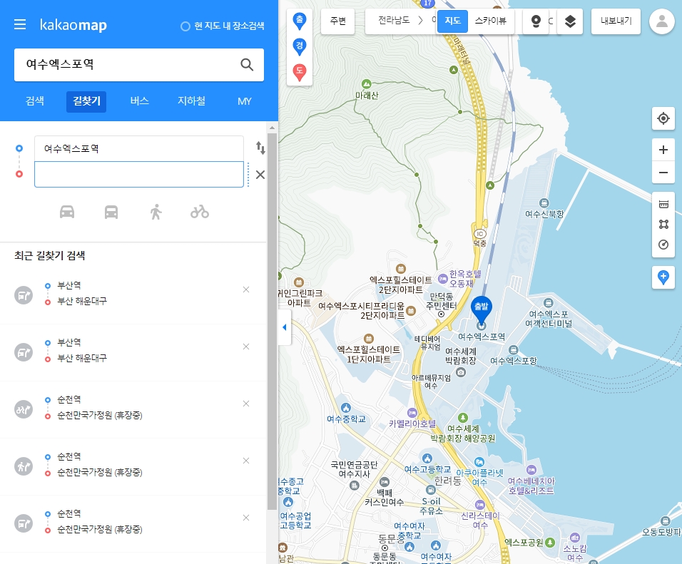 2. 출발지나 도착지 중 하나를 먼저 입력해야 합니다. 저는 출발지부터 설정했는데요, ‘여수엑스포역’을 검색해봤습니다. 이렇게 원하는 장소를 입력하면 지도에 표시되고, 바로 다음 단계로 넘어갈 수 있어요.