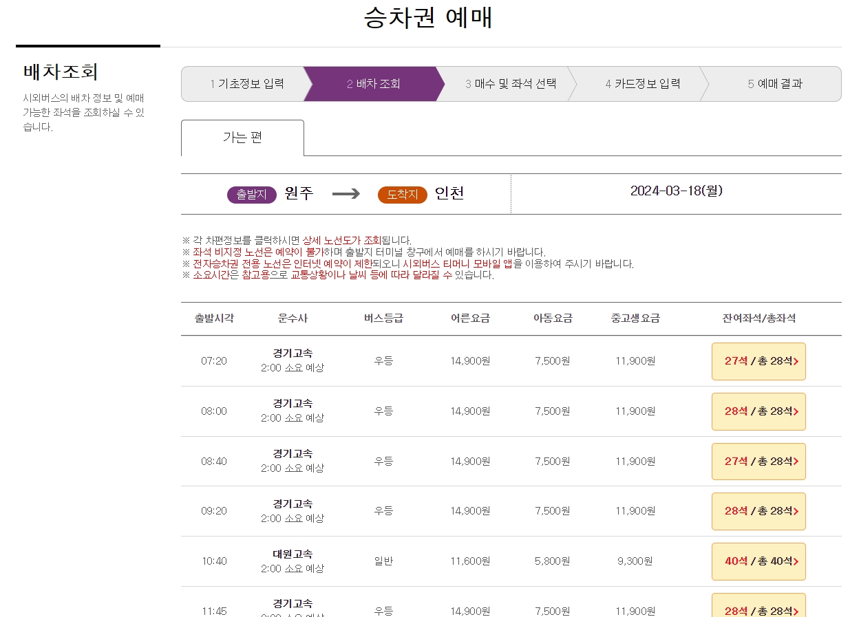 스마트폰이나 PC 브라우저 어디에서나 예매 화면을 열 수 있어서 편해요. 예매 메뉴로 들어가면 달력이 뜨는데, 원하는 날짜를 누르면 그날 운행하는 모든 노선의 출발 시각이 쭉 정렬돼요. 원주 시외 버스 터미널 시간표는 대도시 행, 중소도시 행, 관광지 행 등으로 구분돼서 한눈에 비교하기 편하고, 각 노선별 남은 좌석 수도 함께 볼 수 있어요.