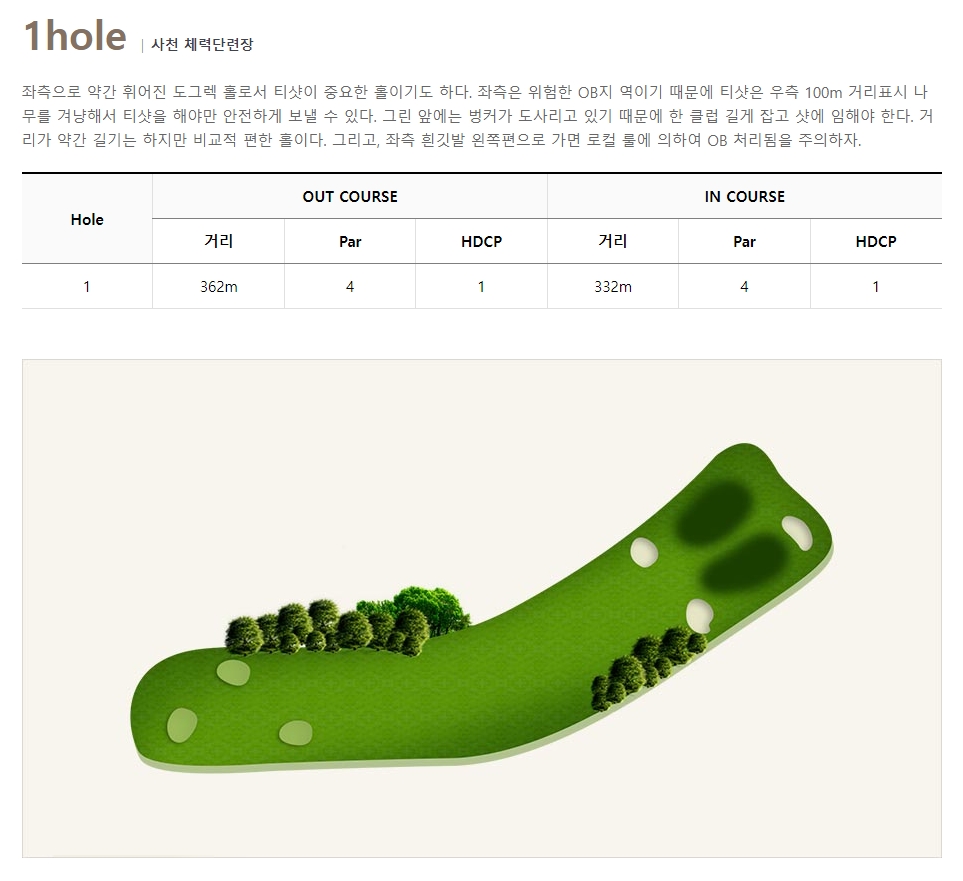 5. 예를 들어 1번 홀은 왼쪽으로 휘어진 도그렉 구조에 362m 거리, 파 4로 되어 있습니다. 이런 정보 덕분에 현장에서 당황하지 않고 준비할 수 있겠더라고요.