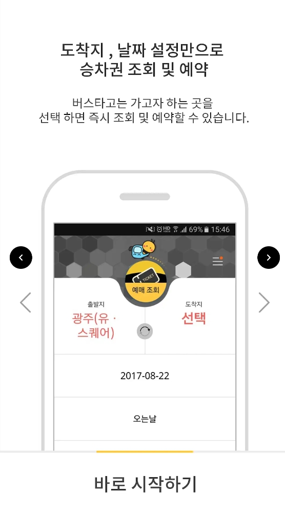 앱 설치 후 실행하면 바로 출발지, 도착지, 날짜 입력창이 나옵니다. 해당 정보만 입력하면 승차권 조회와 예매가 가능합니다. 같은 기능은 버스타고 홈페이지에서도 가능합니다.