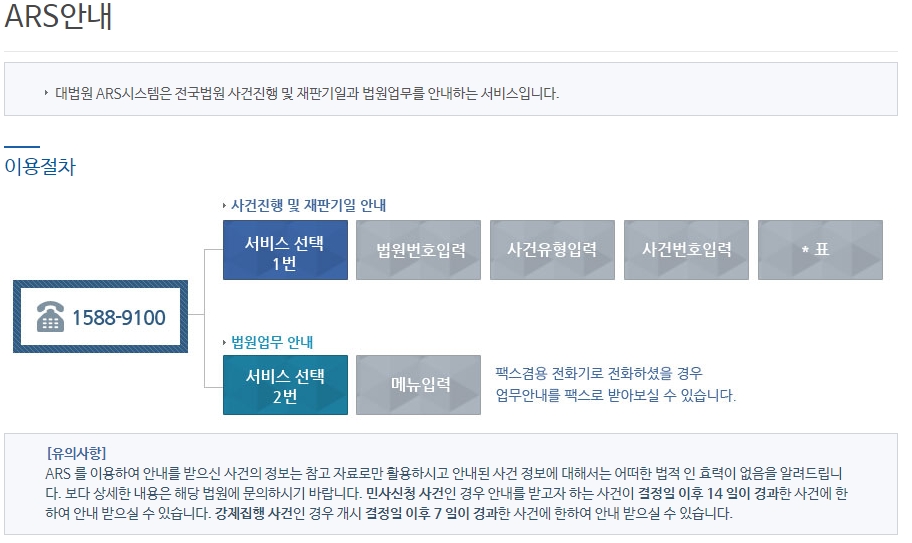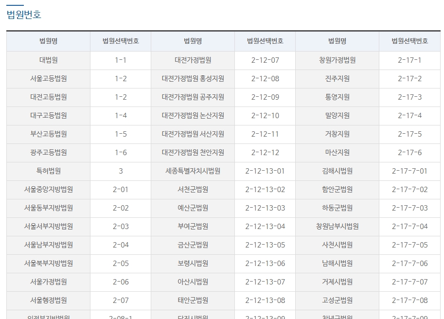ARS에서는 사건 진행상황이나 재판 기일 안내를 받을 수 있는데, 이 경우 법원번호, 사건유형, 사건번호를 모두 입력해야 합니다.법원번호는 아래에 따로 사진이 있습니다.