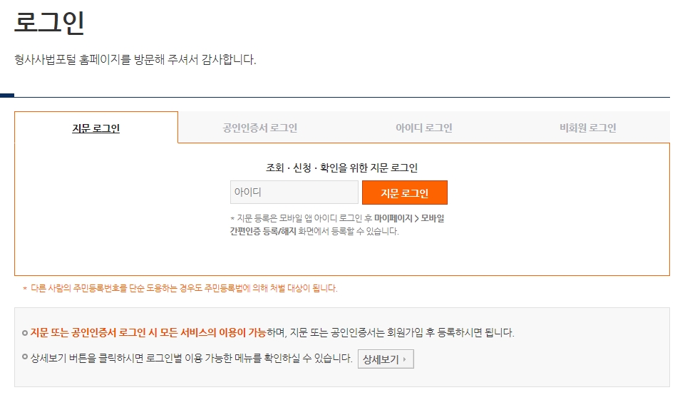지문 인증, 공인인증서, 아이디 로그인, 비회원 로그인 중 본인에게 편한 방법을 선택해서 로그인합니다. 로그인 후에야 사건 정보를 조회할 수 있습니다.