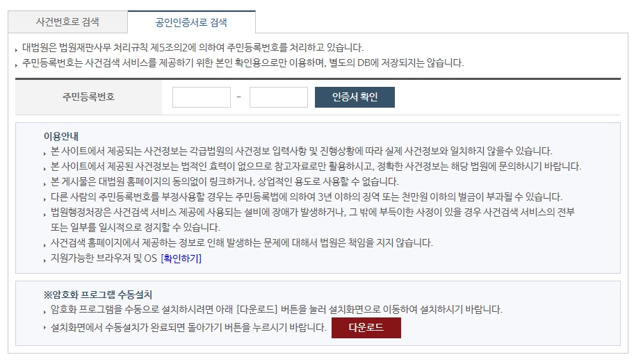 주민등록번호 입력 후 공인인증서를 통해 본인 인증을 하면 사건 검색이 가능합니다. 이 방식은 번호를 모를 때 유용합니다.