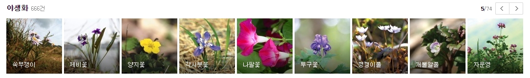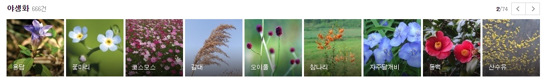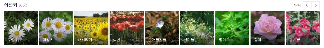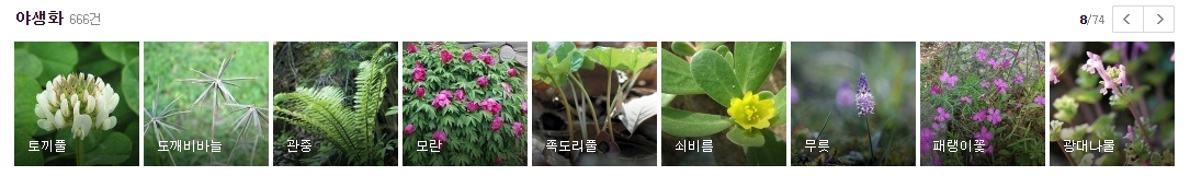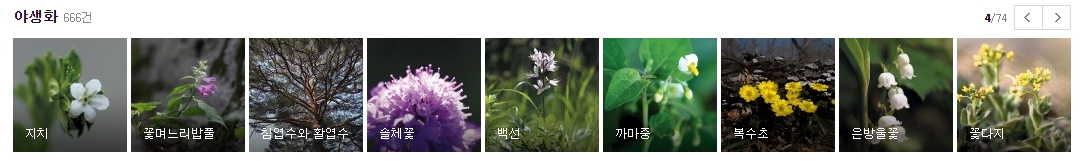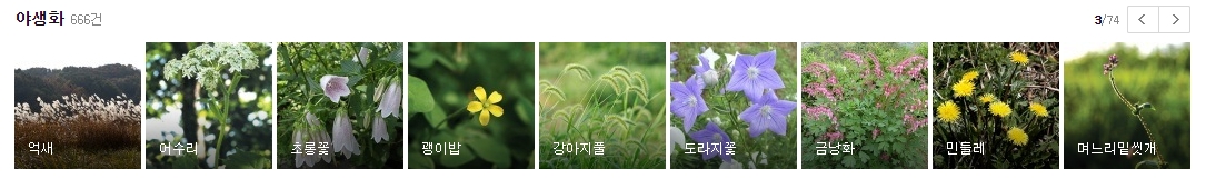 ‘야생화’ 항목을 클릭하면 총 666건의 꽃 목록을 이미지와 함께 확인할 수 있습니다. 원하는 꽃을 찾기 위해 페이지를 넘겨가며 천천히 살펴보세요. 하나하나가 사진과 함께 설명되어 있어 매우 직관적입니다.4. 키워보고 싶은 꽃이 있다면 이름을 검색해보세요.