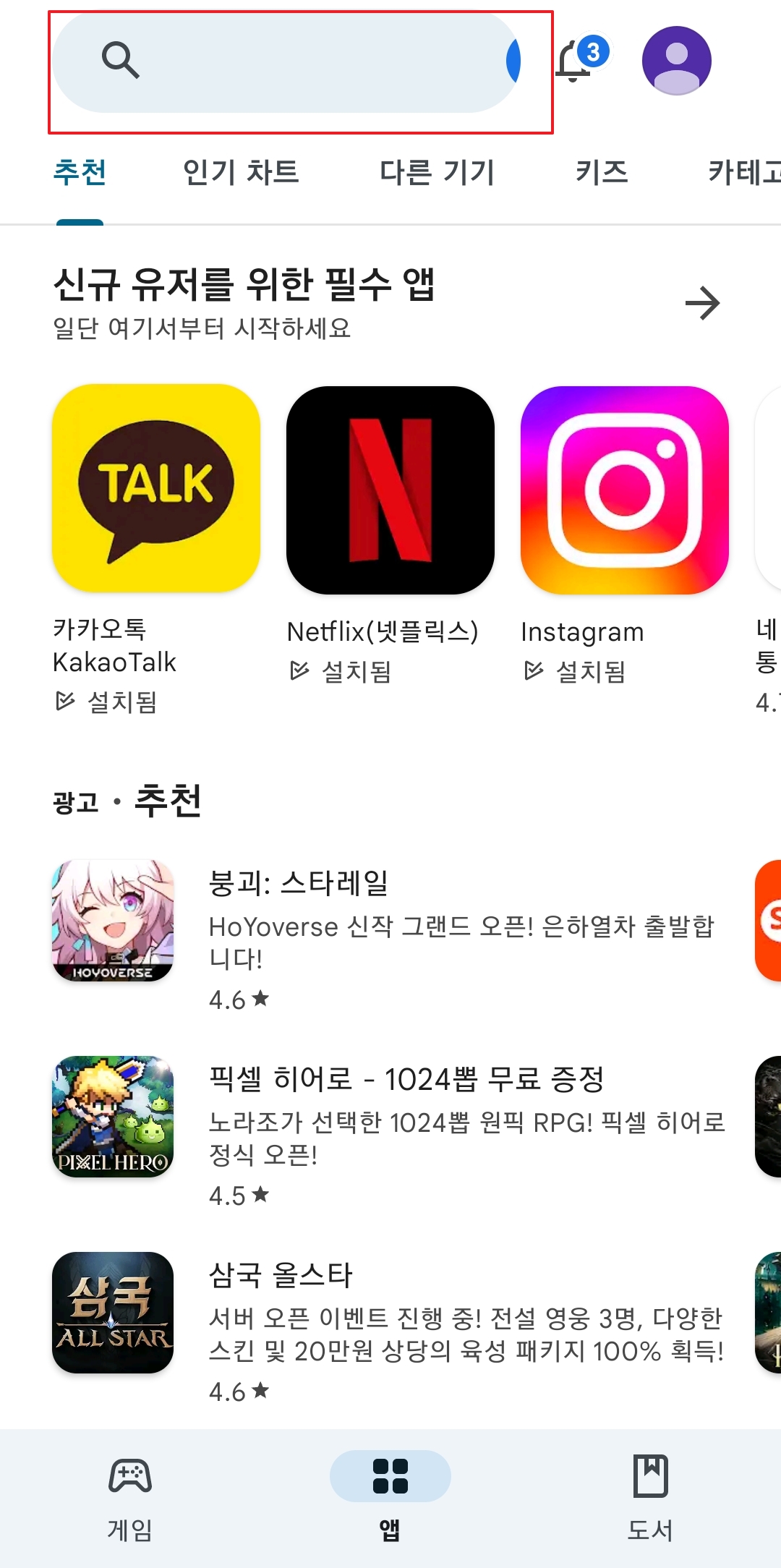 구글 플레이 스토어 앱을 실행한 후, 상단 검색창을 통해 원하는 앱을 검색할 수 있는 초기 화면으로 접속합니다.2. 상단의 검색창을 클릭한 뒤에 티맵을 검색합니다.