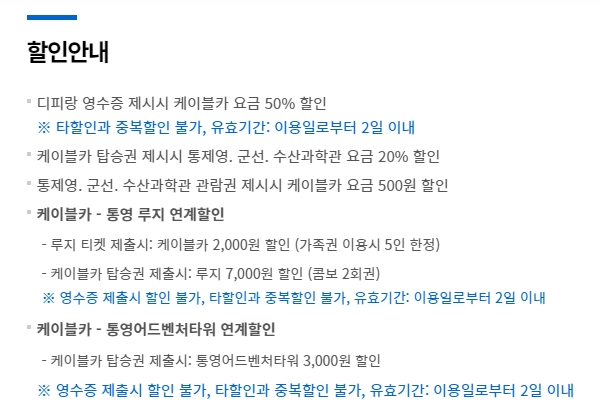 할인 옵션에는 다양한 연계 할인이 포함되어 있습니다. 예를 들어, 디피랑 영수증을 제시하면 케이블카 요금이 50% 할인되고, 케이블카 탑승권을 제시하면 통제영과 군선, 수산과학관 입장료가 20% 할인됩니다. 이 외에도 통영 루지 및 어드벤처타워와의 연계 할인도 제공되고 있습니다.