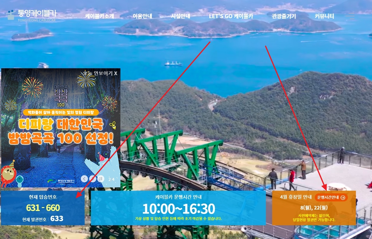 홈페이지 메인 화면에서는 매달 휴장일을 업데이트하고 현재의 탑승 번호와 발권 번호를 안내합니다. 예를 들어, 현재 631번부터 660번까지 탑승 가능하며, 이미 633번까지 3명의 발권이 완료되었습니다.