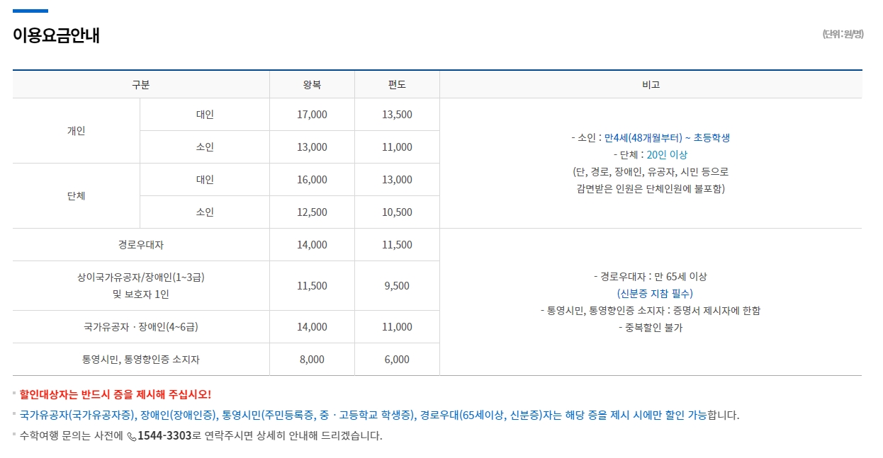 이용 요금은 생각보다 다양해요. 대인 기준으로 왕복은 17,000원이고, 아이들은 13,000원이에요. 만약 친구들이나 가족들 여럿이서 가는 단체라면 20명 이상이면 할인도 받을 수 있고요. 또, 어르신이나 국가유공자, 장애인분들, 통영시민분들에게는 조금 더 저렴하게 이용할 수 있는 특별한 혜택이 준비되어 있어요. 모두가 편하게 즐길 수 있게 배려하는 마음, 정말 따뜻하지 않나요?