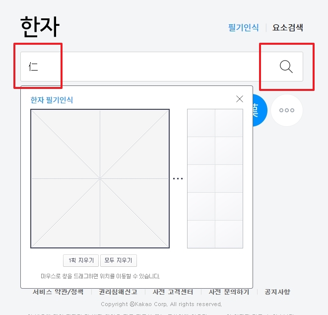 검색창 우측 상단에 있는 '한자 필기인식' 버튼을 클릭하세요. 클릭하면 필기 입력창이 팝업으로 열리고, 여기에 직접 한자를 손으로 그리면 됩니다.