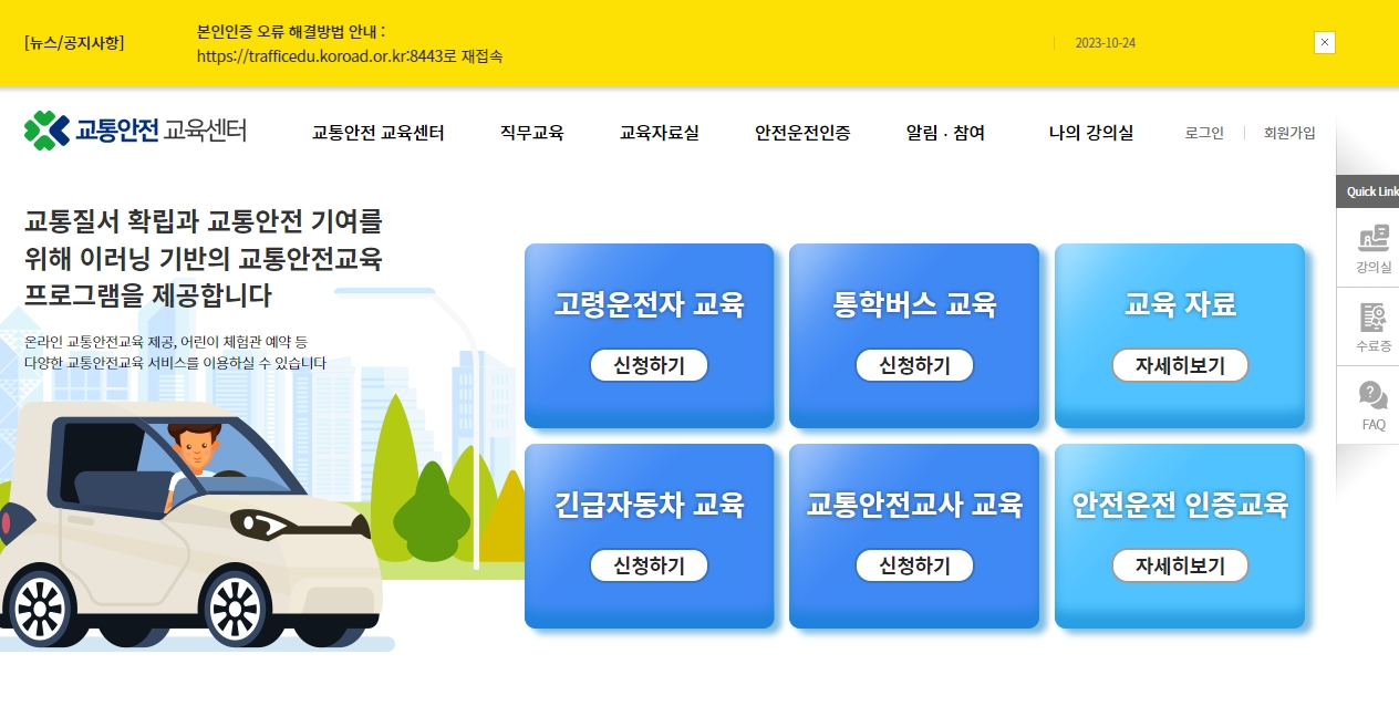 홈페이지 메인 화면에서는 고령운전자, 긴급자동차, 통학버스, 교통안전교사 등을 위한 전문 교육 과정들이 보기 쉽게 정리돼 있어 자신에게 필요한 교육을 바로 확인할 수 있습니다.