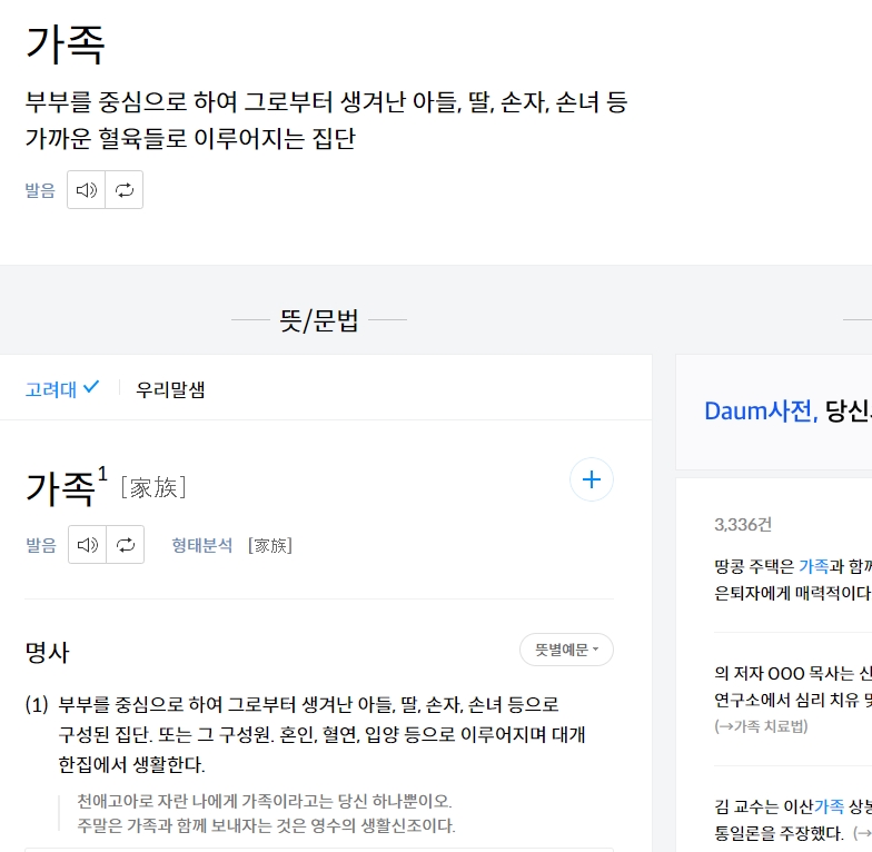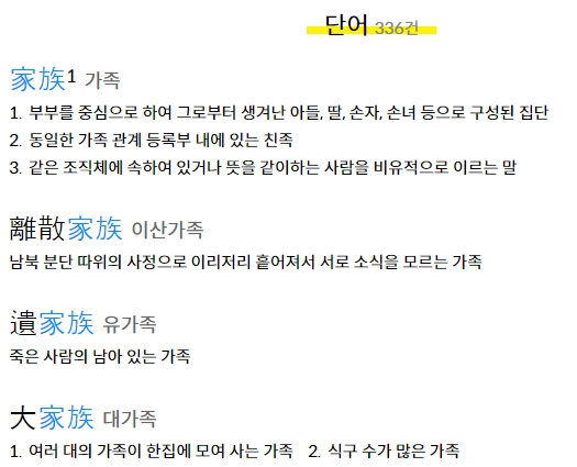 '가족'이라는 단어를 검색하면, 총 336건의 관련 단어가 함께 나타납니다. 예를 들어 이산가족, 대가족, 유가족 등으로 확장된 표현들을 통해 한자의 실제 활용법을 폭넓게 익힐 수 있습니다.
