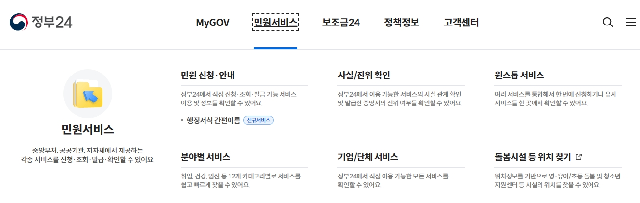정부24 홈페이지로 들어가면 정부 서비스, 민원, 정부 혜택, 정책, 정보를 통합 제공하는 대한민국 정부 대표 포털입니다. 정부24는 다양한 정부 서비스를 한곳에서 쉽게 이용할 수 있게 도와줘서 정말 편리해요.