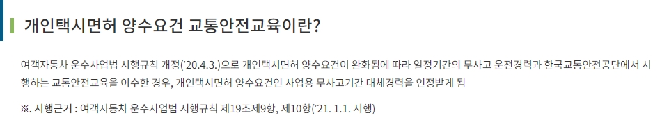 2020년 4월 개정된 여객자동차 운수사업법 시행규칙에 따라, 이 교육을 이수하면 사업용 무사고기간 경력으로 인정받아 개인택시면허 양수가 수월해집니다.