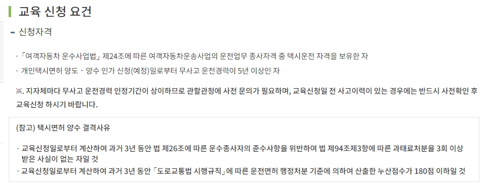 2020년 4월 개정된 여객자동차 운수사업법 시행규칙에 따라, 이 교육을 이수하면 사업용 무사고기간 경력으로 인정받아 개인택시면허 양수가 수월해집니다.5. 교육신청 자격은?