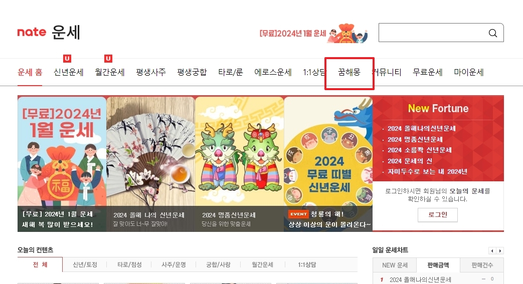 네이트 첫 화면에서 상단의 운세 메뉴를 클릭합니다. 여기서는 오늘의 운세부터 사주, 타로까지 다양한 정보를 확인할 수 있어요.3. 꿈해몽 메뉴 선택