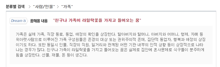 ‘가족’ 카테고리를 선택하면, 가족과 잔치하거나 외출하는 꿈 등 14가지 해몽 결과가 나와요. 상황에 따라 해몽의 뉘앙스가 미묘하게 달라지는 것도 포인트입니다.7. 개별 꿈 선택 - 라일락 꽃