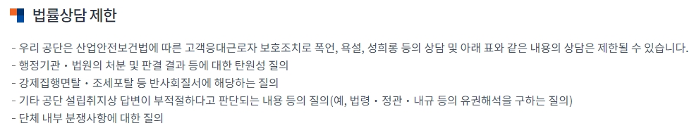 폭언, 욕설, 강제집행 면탈, 반사회적 질의 등은 상담이 제한됩니다. 또한 공단 설립 목적에 맞지 않는 질의나 단체 내부 분쟁 등도 상담 대상에서 제외됩니다.