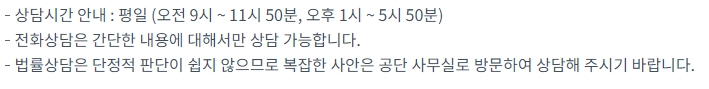 상담은 평일 오전 9시~11시 50분, 오후 1시~5시 50분까지 가능합니다. 다만, 복잡한 법률 문제의 경우에는 전화 상담보다 사무소 방문 상담이 권장됩니다.