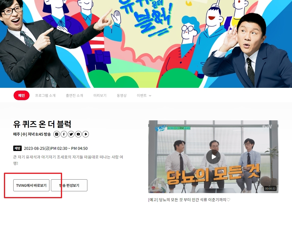 방송 제목을 클릭하면 ‘TVING에서 바로보기’라는 버튼이 나옵니다. 이 버튼을 통해 티빙으로 이동하게 됩니다.