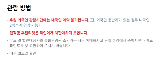 외국인 전용 관람 시간대가 따로 있어서 이 시간에는 내국인의 입장이 제한됩니다. 단, 외국인 동반 시 일정 인원까지 동반 가능하며 할인·무료 대상자는 증빙 서류 지참이 필요합니다.