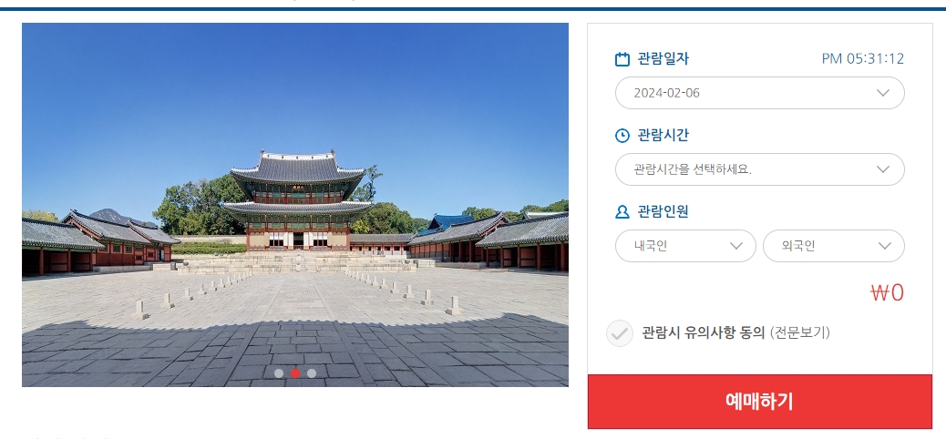 방문 희망일과 시간, 인원을 정확히 입력하고 예매하기 버튼을 클릭하세요. 입력한 정보가 예약 완료 여부를 결정합니다.