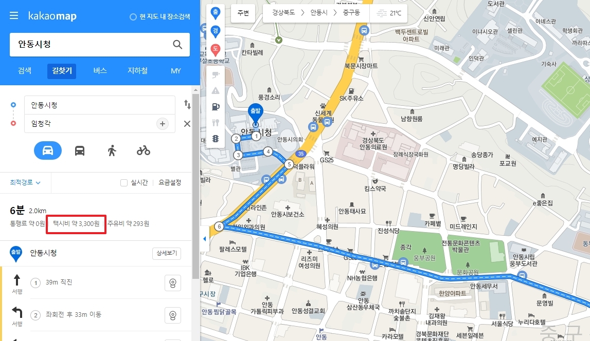 카카오맵 검색창에 출발지 주소를 입력하면 경로 안내와 함께 예상 택시 요금을 바로 확인할 수 있습니다. 단, GPS 권한을 허용해야 정확한 위치 기반 요금이 산출됩니다.