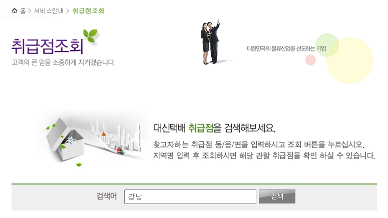 홈페이지 메인 화면 상단에 있는 ‘취급소 조회’ 창에 검색어를 입력하면 원하는 지역의 영업소 목록을 바로 확인할 수 있습니다.