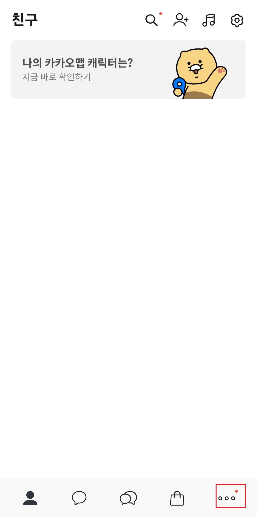 카카오톡을 열고 친구목록 화면에서 우측 하단에 위치한 점 3개 아이콘을 눌러 더보기 메뉴로 진입합니다.