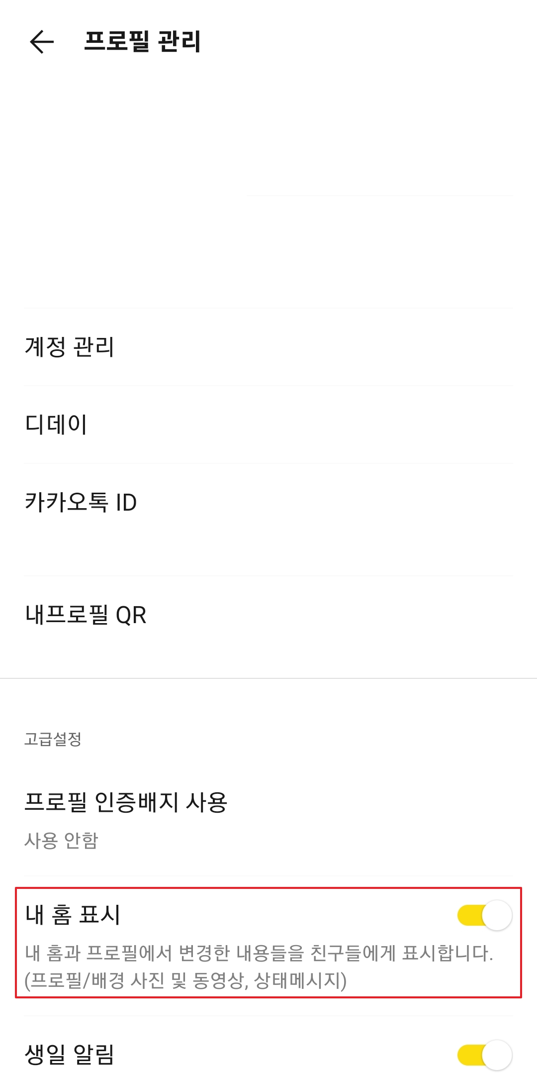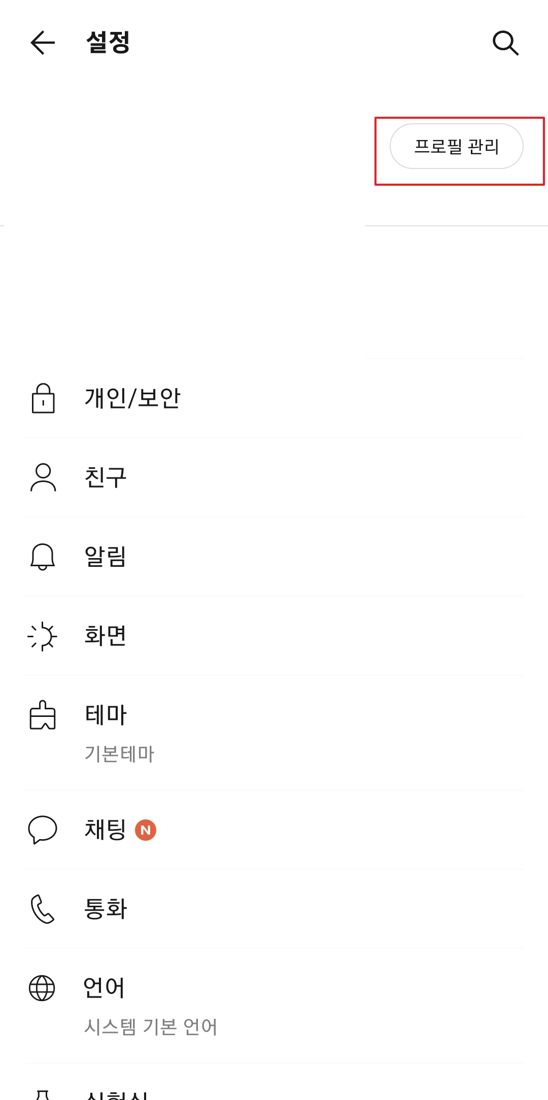 설정창에서 가장 상단에 보이는 ‘프로필 관리’ 항목을 눌러 관련 설정 화면으로 들어갑니다.
