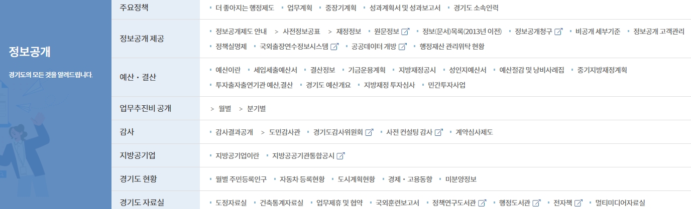 예산, 결산, 정책 자료 등 경기도의 행정 정보를 확인하려면 정보공개 메뉴를 이용하세요. 정책 실명제 자료나 감사 결과도 포함돼 있어서 행정의 투명성과 신뢰성을 확인할 수 있는 핵심 메뉴입니다.