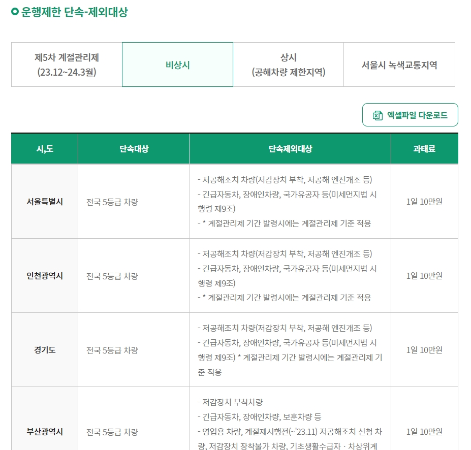 계절관리제, 비상시, 상시, 녹색교통지역 등 상황별로 단속 대상이 구분됩니다. 특히 비상저감조치 발령 시 지자체에 따라 대상 차량이 다를 수 있으며, 5등급 차량이 대부분 해당되며 과태료는 10만원입니다. 본인의 차량과 거주 지역에 따라 적용 여부를 반드시 확인해야 합니다.