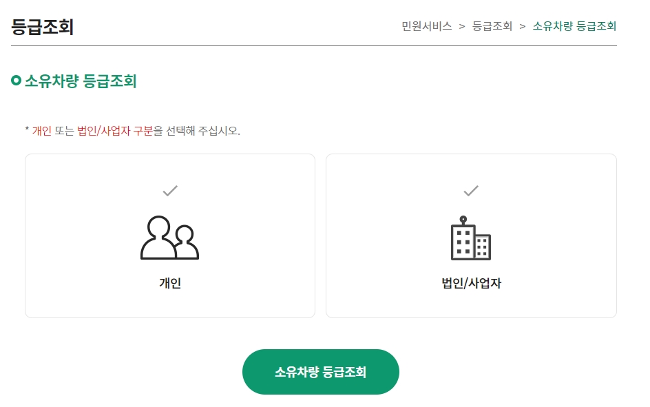 등급조회 메뉴에서는 개인과 법인/사업자 중에서 선택한 뒤 본인 인증을 통해 차량 정보를 확인할 수 있습니다. 이를 통해 자신의 차량이 몇 등급인지 정확하게 확인 가능합니다.