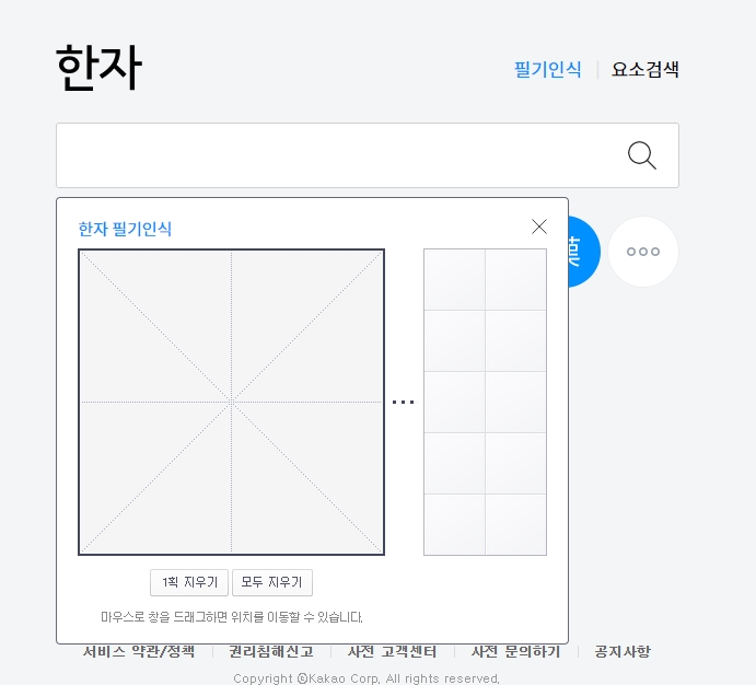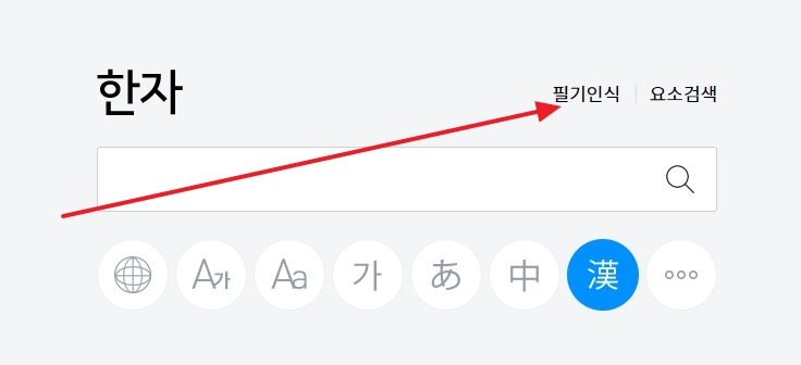홈페이지 검색창 우측 상단의 필기인식 버튼을 클릭하면 필기 인식 창이 나옵니다. 이 창에서 원하는 한자를 그리면 됩니다.