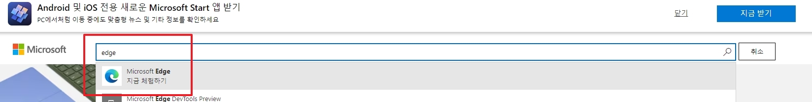 3. 입력된 검색창에 ‘Edge’를 입력하신 뒤, 표시된 아이콘을 선택하면 브라우저 다운로드 페이지로 즉시 이동합니다. 여러 확장 기능이 나열될 수 있지만 아이콘 모양을 통해 빠르게 구별할 수 있습니다.